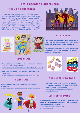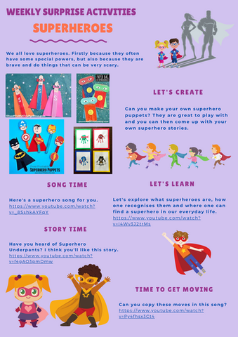 OK I have to admit, this has probably been one of my favourite activity sheets to create so far. I was never much into superheroes as a child. I was more of a princess and fairy type of girl, however this has been fun. Putting together these sheets, searching the internet for activities, craft ideas, stories, songs and games, has really brought out the inner child again.